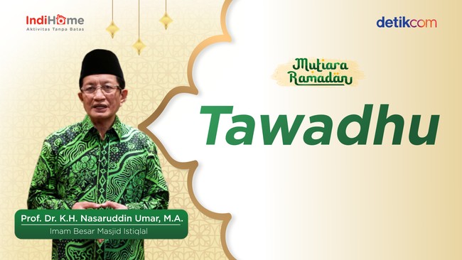 "Tawadhu yang sejati bukan hanya (terlihat pada) mulut atau anggota badan yang tunduk. Tapi hati, pikiran, dan jiwa, semua tawadhu terhadap Allah SWT," kata Imam besar Masjid Istiqlal tersebut melalui Mutiara Ramadan detikcom yang tayang pada Rabu (20/4/2022).