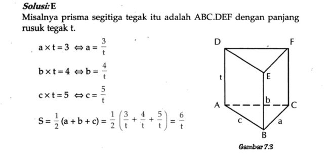 Luas bidang alas suatu prisma tegak segitiga adalah 6 desimeter persegi, luas masing-masing sisi tegaknya adalah 3, 4, dan 5 desimeter persegi. Maka berapa jumlah semua rusuknya?