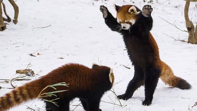 Perilaku panda merah yang berdiri dan mengangkat tangan ini pernah didapati fotografer Dominic Marcoux saat berkunjung ke Granby Zoo Granby, Quebec, Kanada saat musim salju dilansir Daily Mail, Februari 2016 lalu. Marcoux saat itu mengatakan mendapatkan momentum 2 panda merah bermain 'cop and robbers' alias polisi dan perampok, di mana yang satu seperti menodongkan pistol dan satunya berdiri mengangkat tangan seperti gerakan menyerah.