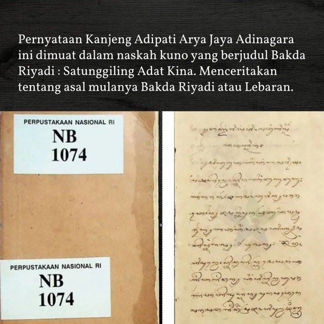 Keterangan Kanjeng Adipati Arya Jaya Adinagara itu tercatat dalam naskah kuno bertajuk Bakda RIyadi: Satunggiling Adat Kina.