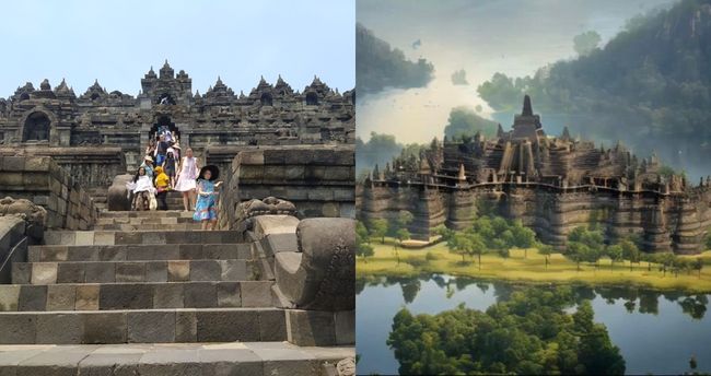 Bagaimana wujud Candi Borobudur di masa lalu? Kreator dengan akun instagram @ainusantara telah menampilkannya dengan teknologi artificial intelligence (AI). Candi Borobudur versi AI berada di tengah sebuah danau. Bagaimana sejarahnya?