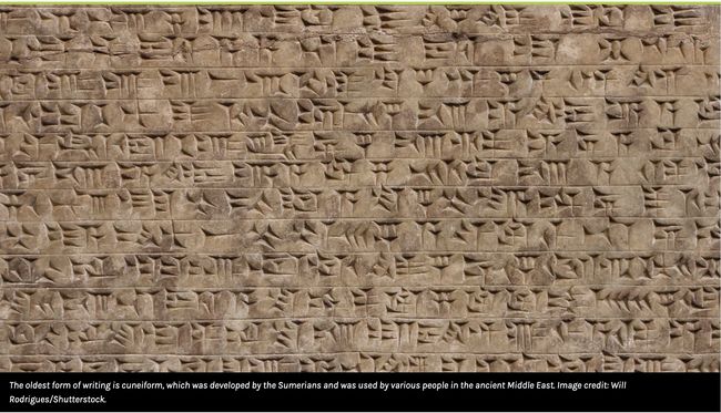 Bentuk penulisan tertua yang saat ini diketahui, dituliskan dalam sebuah tablet atau lempengan batu kapur, dikenal sebagai tablet Kish yang berusia sekitar 3.500 SM. Tablet ini ditemukan pada situs kota kuno Sumeria yang disebut Kish, saat ini dikenal sebagai Irak modern.