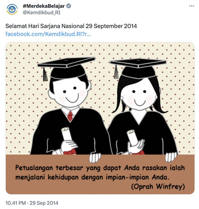Hari Sarjana Nasional 29 September pertama dicuitkan oleh akun Twitter Kemendikbud pada 29 September 2014 lalu. Ini fakta-fakta unik di baliknya.