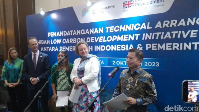 Inggris Raya dan Indonesia menyepakati Technical Agreement Inisiatif Pembangunan Rendah Karbon Tahap 2 di Kantor Kementerian Perencanaan Pembangunan Nasional/Badan Perencanaan Pembangunan Nasional, Menteng, Jakarta Pusat, Senin (2/10/2023). Penandatanganan dukungan resmi Inggris atas Low Carbon Development Initiative (LCDI) Phase 2 Indonesia ini disaksikan Menteri PPN Suharso Monoarfa dan Menteri Inggris untuk Indo-Pacific Anne Marie-Trevelyan.