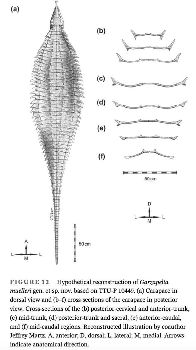 Lapisan keras pelindung atau karapas aetosaurus tersebut ditemukan bersama kerangkanya, yang meliputi sisi kiri dan kanan badan. Menurut peneliti, temuan spesies Garzapelta muelleri menjadi wawasan baru tentang varias karapas punggung khas Aetosauria.