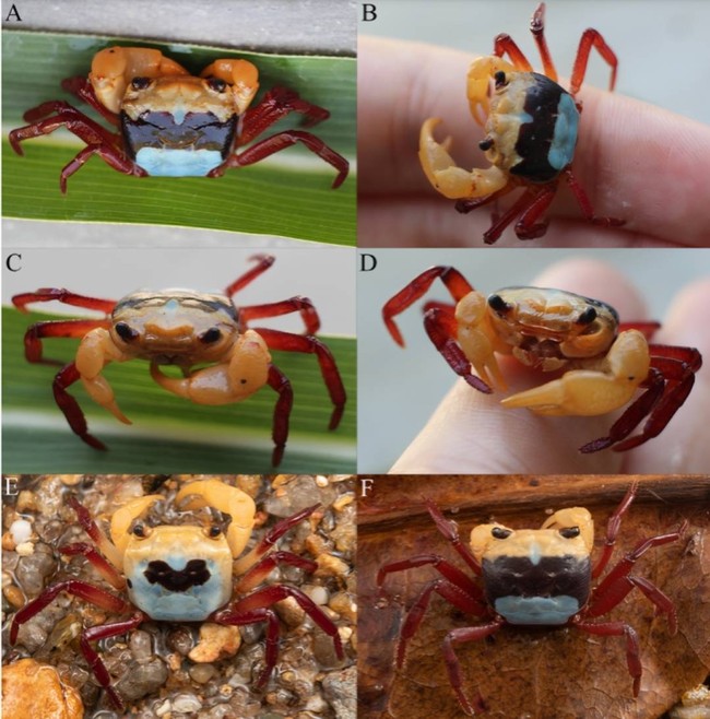 Hanya berukuran 10mm, kepiting ini memiliki kombinasi warna yang unik. Karapasnya (punggung) licin memiliki pola tiga warna yang kontras.
