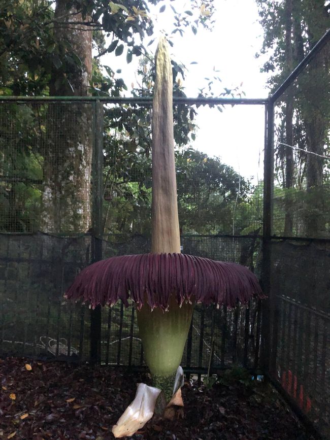 Berdasarkan pemantauan unit pengelolaan koleksi ilmiah Kebun Raya Cibodas, tunas mulai teramati pada 16 Februari 2024. Bunga mekar sempurna pada Jumat dini hari (19/4/2024) pukul 00.56 WIB dengan tinggi spadik 310,5 cm dan diameter spatha 161 cm.