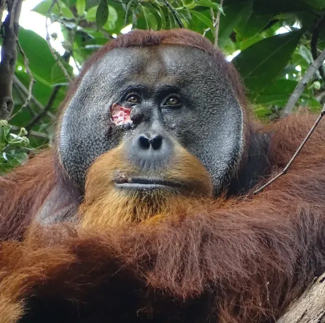Dalam sebuah makalah baru, para peneliti menjelaskan bagaimana orang utan jantan bernama Rakus mengunyah daun tanaman yang digunakan dalam pengobatan tradisional. Kemudian ia mengoleskannya pada luka di pipinya.