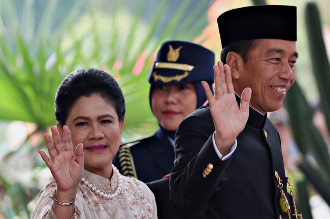 Pakaian adat Betawi Jokowi tampak terdiri dari kopiah hitam sebagai aksesori tutup kepala, jas tutup hitam, inner putih, celana pantalon hitam, dan kain batik di pinggang. Sedangkan Iriana dengan rambut disanggul mengenakan baju kurung krem, selendang, dan bawahan kain songket berwarna senada, serta aksesori anting dan kalung mutiara.