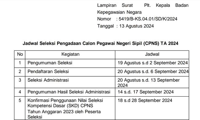 Berikut jadwal CPNS 2024 berdasarkan Surat Plt. Kepala BKN 5419/B-KS.04.01/SD/K/2024 perihal Jadwal Seleksi Pengadaan CPNS TA 2024: