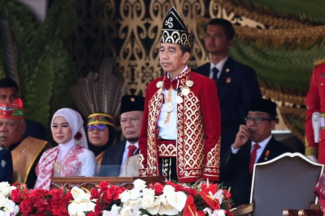 Presiden Joko Widodo mengenakan busana yang terinspirasi dari pakaian adat Banjar, Kalimantan Selatan dalam upacara penurunan bendera pusaka di Ibu Kota Nusantara (IKN), Sabtu (17/8/2024). Tampak busana Presiden Jokowi didominasi warna merah.