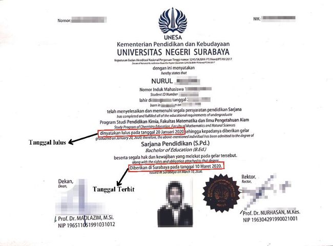 Perlu diketahui, dalam Ijazah terdapat 2 tanggal penting, yakni tanggal kelulusan dan tanggal terbitnya ijazah. Tanggal lulus adalah tanggal ketika seorang mahasiswa dinyatakan lulus kuliah. Sedangkan tanggal terbit ijazah adalah waktu ijazah tersebut dikeluarkan oleh pihak sekolah atau universitas.