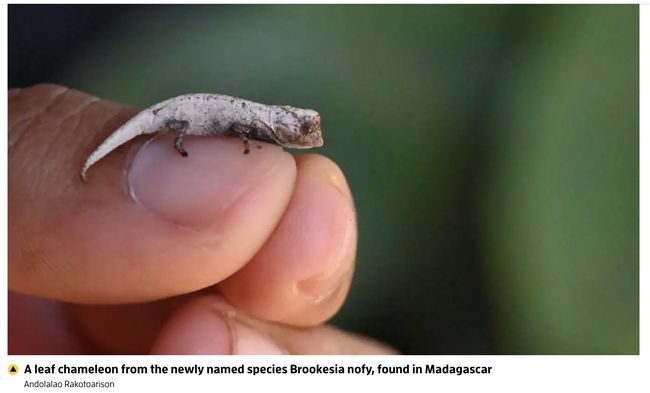 Spesies bunglon daun baru dalam dunia sains, berukuran kurang dari setengah panjang jari telunjuk manusia, telah ditemukan di sepetak kecil hutan hujan pesisir Madagaskar yang sangat terancam punah. Miguel Vences di Universitas Teknik Braunschweig di Jerman dan rekan-rekannya diberitahu tentang keberadaannya oleh wisatawan yang mengunggah foto reptil kecil itu di internet. Kolaborator Vences dari Malagasi, Andolalao Rakotoarison dan Alida Frankline Hasiniaina, pergi mencarinya dan mengumpulkan sampel pertama, seperti dilaporkan oleh New Scientist.