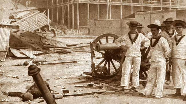 Tepat pukul 9:00 pagi Rawson memerintahkan HMS Racoon, Thrush, dan Sparrow untuk menembaki istana, yang dengan cepat dilalap api. Lima ratus korban jatuh di pihak prajurit Khālid saat Inggris menghentikan tembakan 40 menit kemudian, hanya satu pelaut Inggris yang terluka parah.