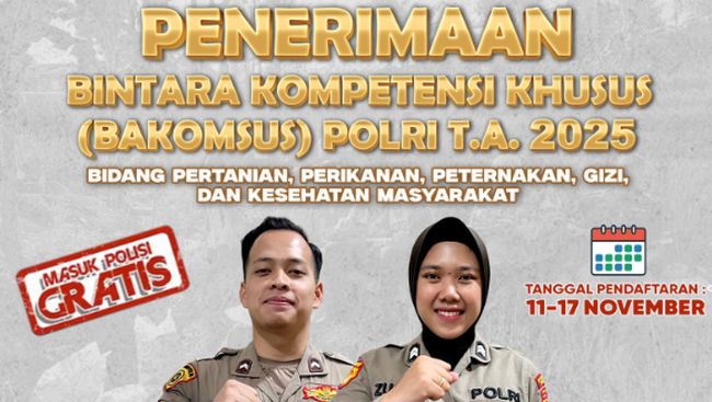 Pendaftaran Bintara Kompetensi Khusus (Bakomsus) Polri 2025 dibuka mulai 11 November. Lulusan SMK sampai S1 bisa daftar.