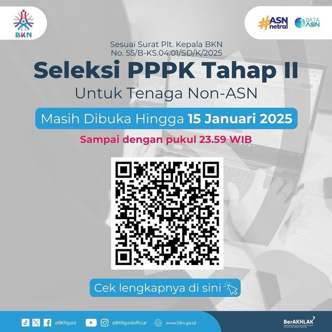Namun, Badan Kepegawaian Negara (BKN) mengumumkan peserta yang memenuhi kualifikasi dan belum terdaftar mendapat tambahan waktu hingga 15 Januari 2025 pukul 23.59 WIB mendatang. Perpanjangan waktu ini kembali menyesuaikan lini masa pendaftaran PPPK tahap 2.