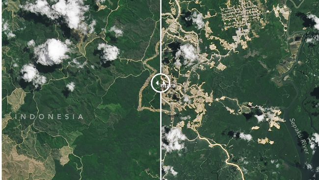 Lembaga Antariksa Amerika Serikat (AS) atau National Aeronautics and Space Administration (NASA) tampilkan perbedaan kenampakan wilayah Ibu Kota Nusantara (IKN) di tahun 2022 dan 2024. Terlihat dataran yang dulunya hijau karena hutan mulai berkurang.