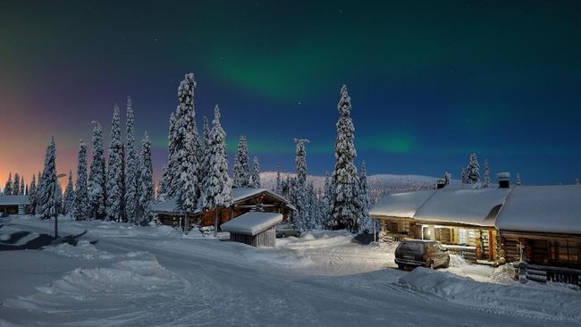 Aurora dapat menari di langit yang gelap dan saat bulan purnama menerangi seluruh pemandangan musim dingin.
