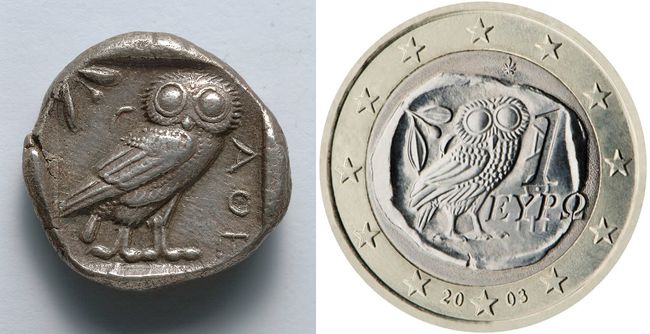 Dikutip dari laman Cleveland Museum of Art, desain awal koin burung hantu Yunani kuno kini dipakai lagi di koin pecahan 1 euro Yunani. Berdasarkan keterangan European Central Bank, koin dengan yang mengabadikan desain kuno ini sah berlaku.