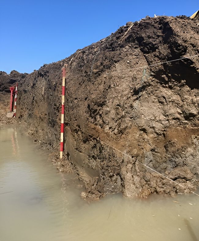 Di bawahnya, jejak tsunami berusia 3.000 tahun berupa lapisan pasir yang kaya mikrofauna dari laut. Cangkang biota laut foraminifera di sana berisi mineral yang hanya terbentuk di lingkungan laut.