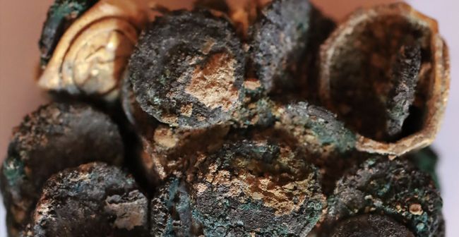 Harta karun ini ditemukan dalam bentuk yang sudah meleleh di dalam sisa-sisa rumah terbakar. Ada 40 koin hingga ornamen logam mulia.