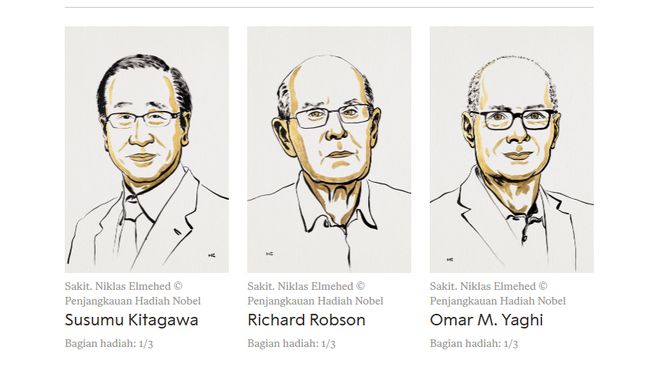 Peraih Nobel Kimia 2025 telah diumumkan. Susumu Kitagawa, Richard Robson, dan Omar Yaghi mendapatkan anugerah tersebut.