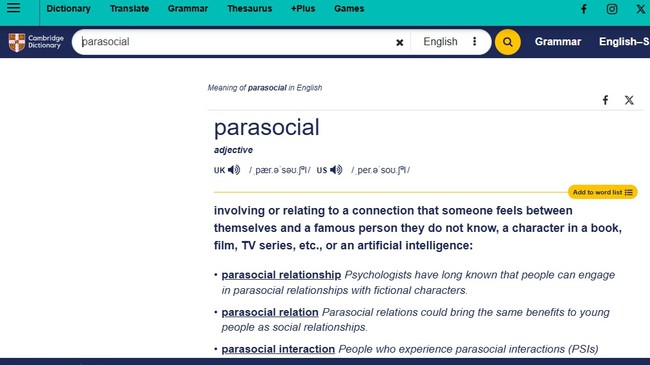 Definisi parasosial dalam kamus Cambridge adalah koneksi yang dirasakan seseorang antara dirinya dengan orang populer yang tidak dikenalnya; karakter dalam buku, film, serial TV; atau kecerdasan buatan.