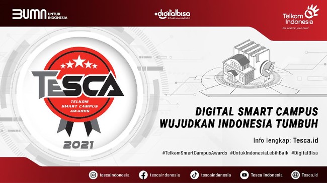 PT Telkom Indonesia (Persero) Tbk (Telkom) memberi dukungan bagi sektor pendidikan dalam momentum Hari Kemerdekaan RI ke-76 tahun ini. Dukungan ini diberikan dengan menyelenggarakan program Telkom Smart Campus Awards (TeSCA) 2021 dengan tema 'Digital Smart Campus Wujudkan Indonesia Tumbuh'.