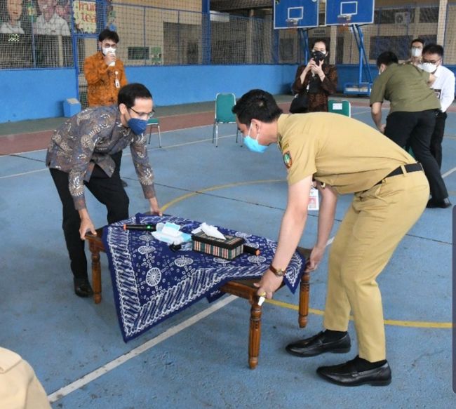 Rupanya Nadiem melihat posisi kursi dan meja yang akan digunakan terlalu jauh dengan tempat duduk para guru. Bukannya meminta tolong ke pegawai atau staf protokol yang berada di sekitarnya, Mendikbud berinisiatif mengangkat meja dan bangku sendiri.