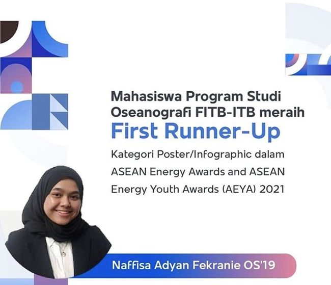 Mahasiswa Program Studi Oseanografi Institut Teknologi Bandung (ITB), Naffisa Adyan Fekranie berhasil menorehkan prestasi di ajang ASEAN Energy Awards and Asean Energy Youth Awards (AEYA) 2021. Naffisa meraih First Runner-Up Kategori Poster/Infografis.