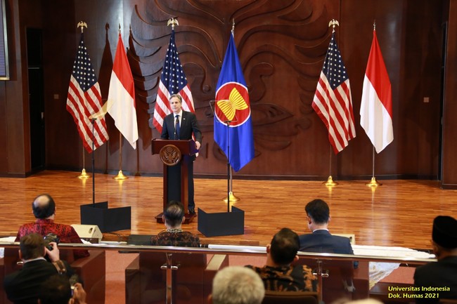 Menteri Luar Negeri Amerika Serikat (AS) Antony J. Blinken menyampaikan pentingnya kawasan Indo-Pasifik dan kemitraan Strategis antara AS dan Indonesia saat berpidato di Universitas Indonesia, Selasa (14/12/2021). Salah satu hal yang diungkapkan Blinken yakni komitmen AS meningkatkan keamanan Indo-Pasifik.