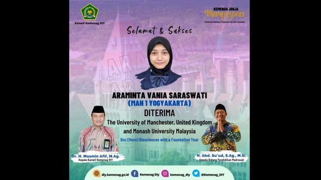 Madrasah Aliyah Negeri (MAN) kembali mengukir prestasi. Kali ini dari siswi MAN 1 Yogyakarta, Araminta Vania Saraswati, yang dikabarkan lolos seleksi penerimaan mahasiswa baru di 2 universitas luar negeri sekaligus.