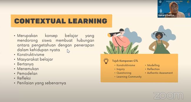 Dalam webinar Selasa Seru yang dilaksanakan pada Selasa (12/7/2022), Guru Besar Universitas Negeri Surabaya (Unesa), Prof Dr. Gunarti Dwi Lestari, M.Si., M.Pd., memaparkan terkait 7 komponen Contextual Learning.