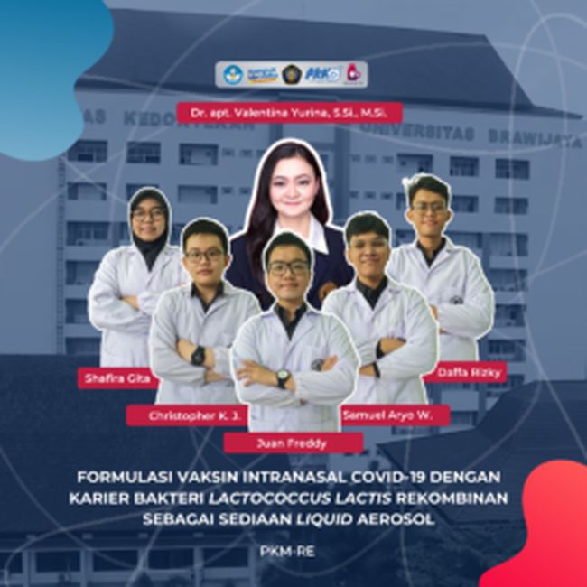Lima mahasiswa Farmasi Fakultas Kedokteran Universitas Brawijaya (UB) berhasil menciptakan vaksin COVID-19. Inovasi ini mereka ajukan dalam rangka Program Kreativitas Mahasiswa (PKM).