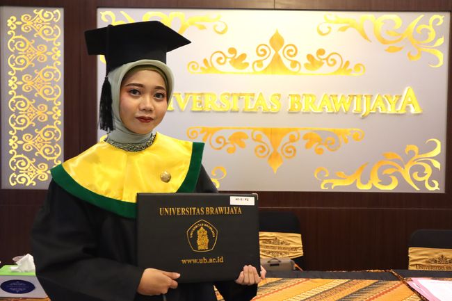 Evalina nampak tersenyum di depan papan tulisan almamater Universitas Brawijaya (UB) Malang. Lengkap dengan toga, perempuan itu memegang ijazah yang baru saja ia terima.