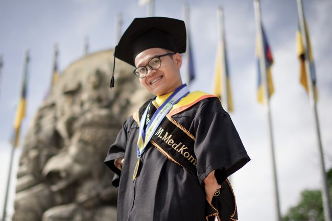 Umar Syahroni bukanlah penyandang disabilitas sembarangan. Meskipun fisiknya tak sempurna, ia mampu meraih gelar sebagai master dalam bidang media dan komunikasi dari Universitas Airlangga (Unair).