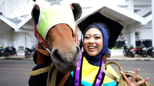 Salah satu wisudawan Universitas Muhammadiyah Malang (UMM), Nur Avia Aminia Junaedy memiliki ide menarik untuk membuat kenangan di momen kelulusannya. Dia datang mengendarai kuda dengan diikuti rombongan keluarga yang naik empat dokar.