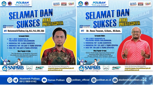 Dua dosen Politeknik Negeri Banjarmasin (Poliban) masuk dalam Asia Top 10.000 Scientists dan Indonesia Top 10.000 Scientists berdasarkan AD Scientific Index. Keduanya adalah Mochammad Arif Budiman, PhD dan Dr Reza Fauzan.