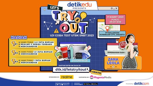 Mumpung UTBK-SNBT akan digelar pada Mei 2023 nanti, masih ada 2 bulan-an persiapan yang bisa dilakukan agar peluang masuk ke kampus incaran detikers makin besar. Try out UTBK-SNBT detikEdu, 'Let's Try It Out' akan digelar offline pada 11 Maret 2023 di Ballroom Kuningan City, Jl Prof DR Satrio, Kuningan, Karet Kuningan, Jakarta Selatan.