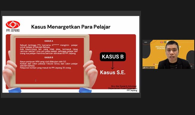 Ditambahkan Farid Auzzin Ashari dari Biro Kajian Strategis PPI Jepang, menyampaikan Kajian Pelindungan Pelajar Indonesia di Jepang dan masalah-masalah utama yang dihadapi pelajar Indonesia di Jepang, antara lain black baito (eksploitasi kerja paruh waktu-red), academic harassment (pelecehan akademik), sexual harassment (pelecehan seksual), dan penipuan agen pendidikan.