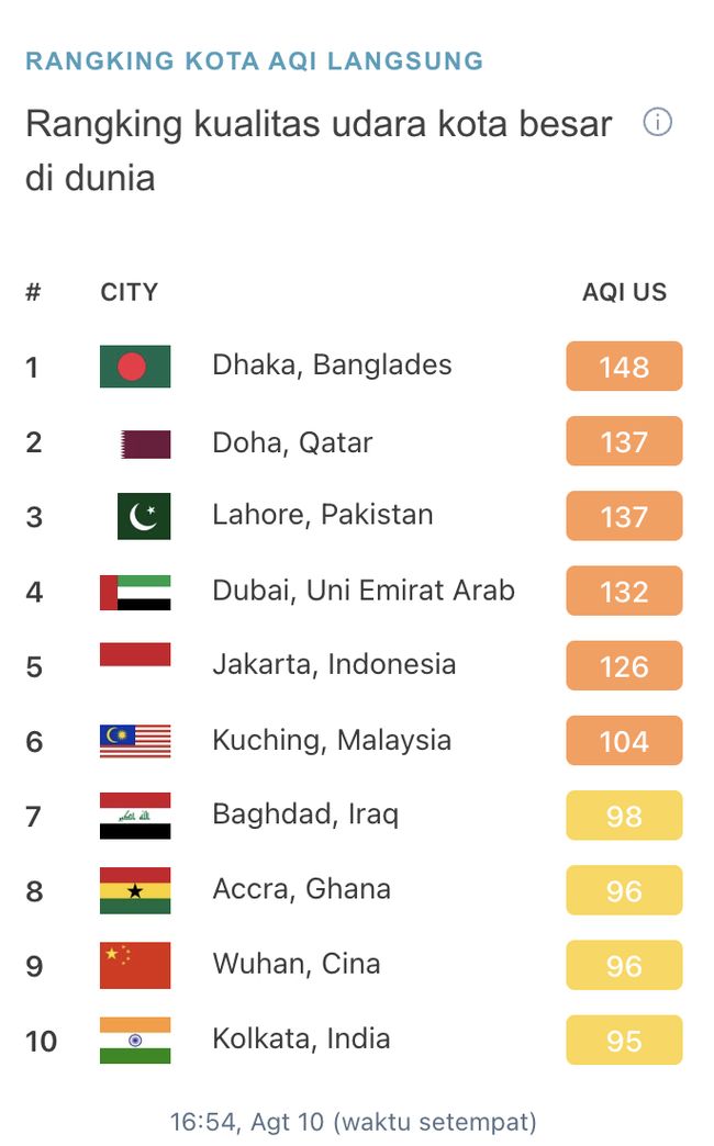 Dicek detikEdu di platform IQAir saat berita ini ditulis, Kamis (10/8/2023) per pukul 16.54 WIB, Jakarta berada di urutan 5 kota paling berpolusi di dunia. Status warnanya oranye, dengan angka indeks 126. Arti dari warna oranye, tidak sehat bagi kelompok sensitif.