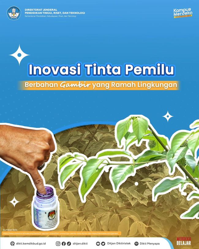 Universitas Andalas ciptakan inovasi tinta organik yang ramah lingkungan atau eco-friendly dari komoditas terbesar di Sumatera Barat, yakni tanaman gambir. Tinta ini nantinya akan dikomersialisasikan untuk kegiatan Pemilihan Umum (Pemilu) tahun 2024.