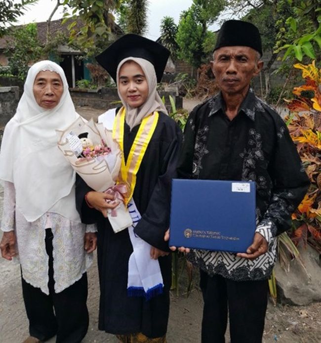 Wisudawan dengan IPK 3,66 itu berhadap dengan bekal ilmu, pelajaran, dan pengetahuan yang telah diberikan, ia mampu mengimplementasikannya di dunia kerja sehingga dapat berbakti dan membanggakan orang tuanya yang telah berjuang hingga di titik sekarang serta dapat bermanfaat dan berguna bagi orang lain.