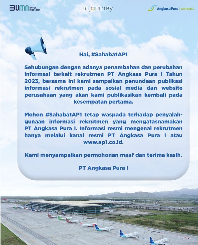 PT Angkasa Pura I menunda pembukaan rekrutmen pegawai. Hal ini karena ada penambahan dan perubahan informasi terkait rekrutmen PT Angkasa Pura I. Keterangan yang dimuat di Instagram resmi AP I ini mencabut informasi sebelumnya tentang pembukaan rekrutmen AP I yang telah dimuat detikEdu dengan judul: PT Angkasa Pura I Buka Rekrutmen Pegawai Lulusan D3, Kuota 20.000 Orang!.
