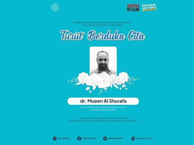 Kabar duka datang dari salah satu alumni Universitas Gadjah Mada (UGM) dan Universitas Sebelas Maret (UNS), dr Mueen Al Shurafa SpAn. Ia dikabarkan meninggal dunia setelah tempat tinggalnya di Palestina terkena serangan bom dari Israel.