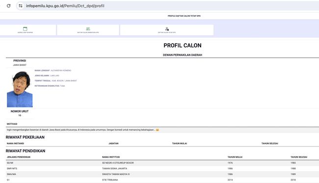 Nama yang tercantum di situs itu Alfiansyah Komeng. Riwayat pendidikan yang tercantum dalam situs KPU itu sebagai berikut: