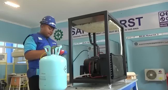 Siswa Jurusan Teknik Pendingin dan Tata Udara, SMK Muhammadiyah 1 Gresik, Muhammad Ilham Maulana, menjelaskan bahwa mesin pendingin cold storage yang diciptakan menggabungkan teknologi terbarukan.