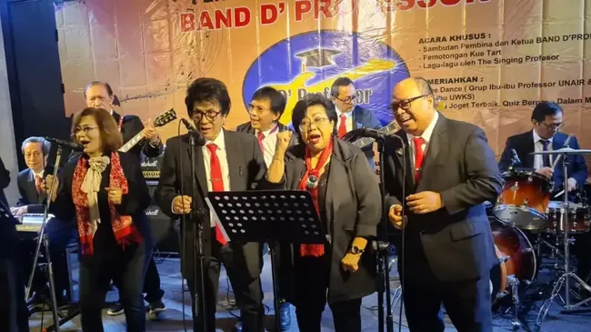 Guru besar perguruan tinggi identik dengan penelitian, pengajaran, dan pengabdian. Di sela kesibukannya, 41 guru besar Universitas Airlangga (Unair) turut bermusik dalam band D'Professor.