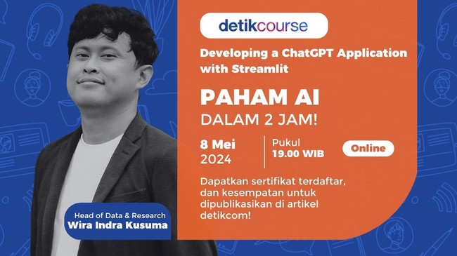 Dipandu oleh para ahli dari detikcom, kelas AI ini menawarkan pemahaman mendalam tentang konsep AI dalam waktu singkat, hanya 2 jam, bersama Wira Indra Kusuma, Head of Data and Research detikcom.