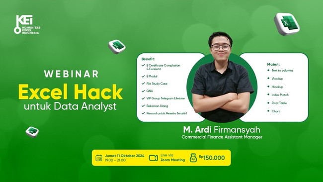 Di webinar ini, kamu dipandu oleh M Ardi Firmansyah, seorang Commercial Finance Assistant Manager yang memiliki pengalaman luas dalam memanfaatkan Excel untuk kebutuhan bisnis. Materi yang akan kamu pelajari meliputi: